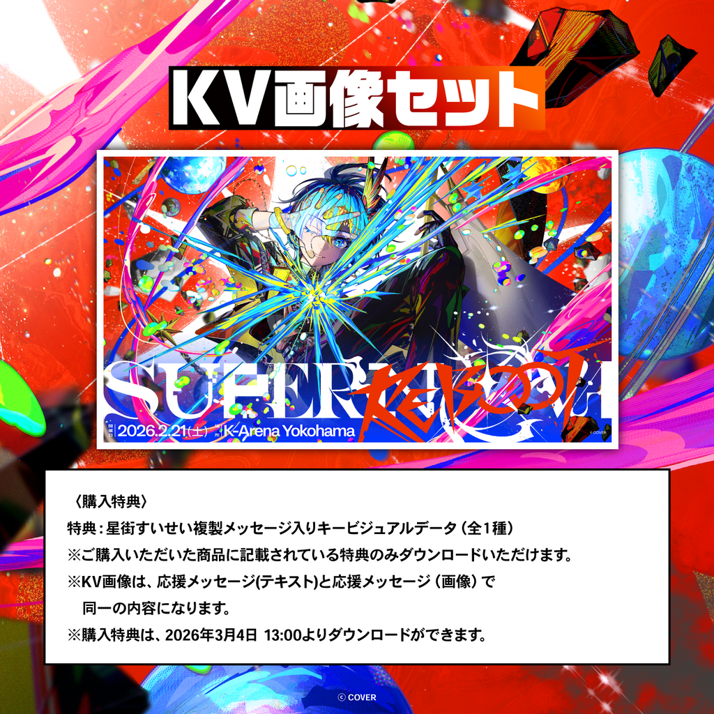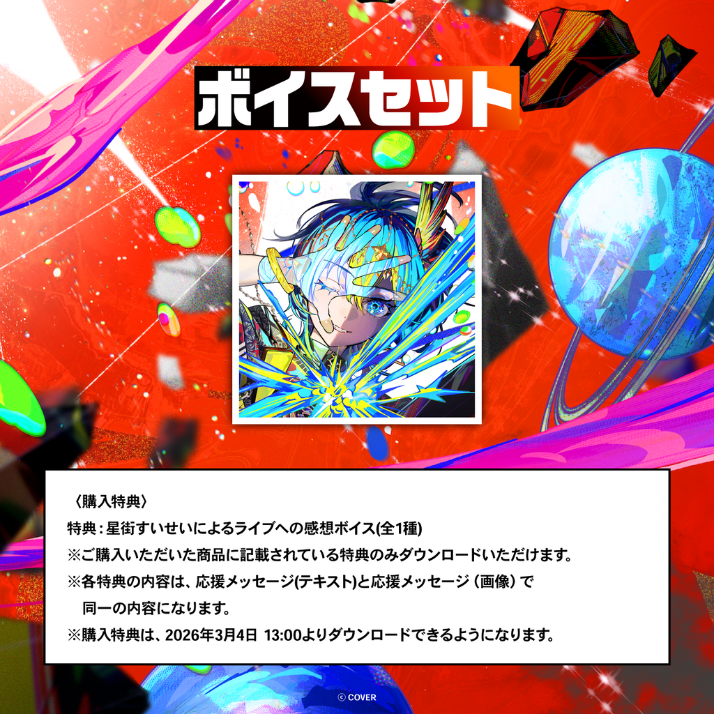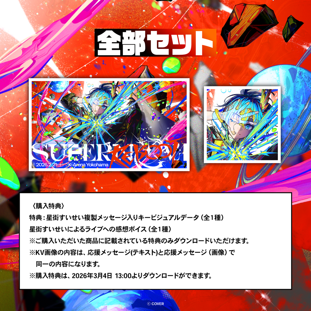 全部セット:星街すいせい複製メッセージ入りキービジュアルデータ(全1種)、星街すいせいによるライブへの感想ボイス(全1種)