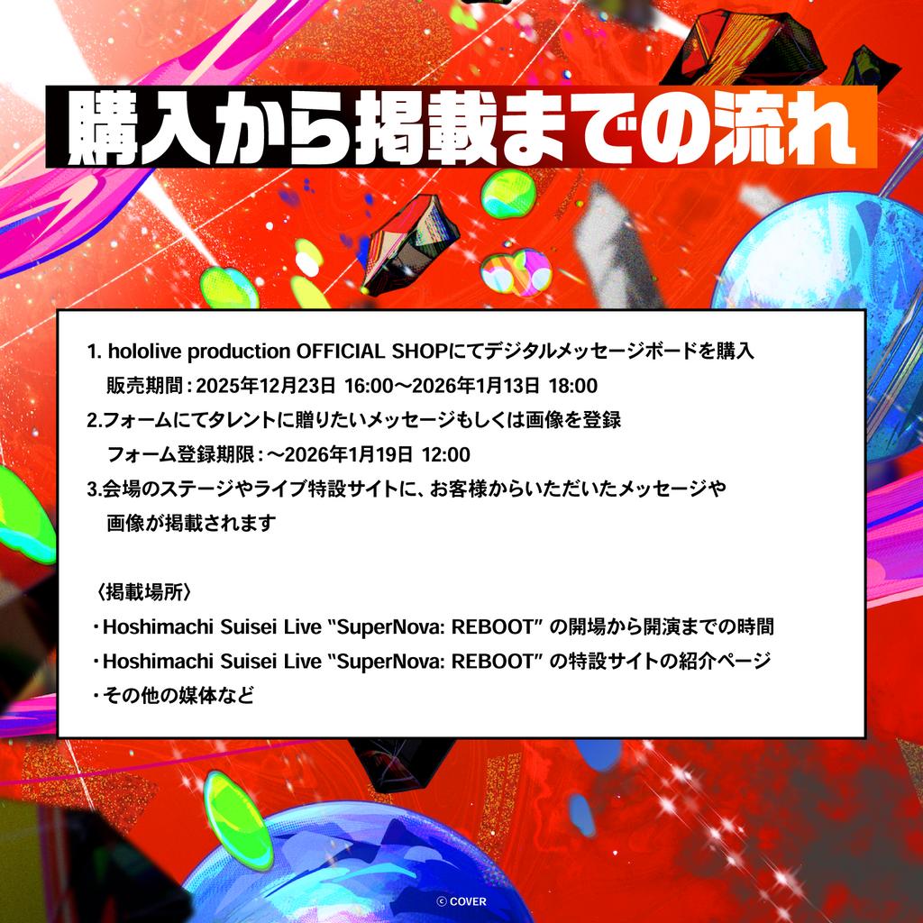 お届け予定日:購入特典は2026年3月4日 13:00よりダウンロードできます。2026年2月21日(土)に開催される、「Hoshimachi Suisei Live “SuperNova: REBOOT”」に出演するタレントへ向けて、応援メッセージを贈ることができるデジタルメッセージボードの販売です。