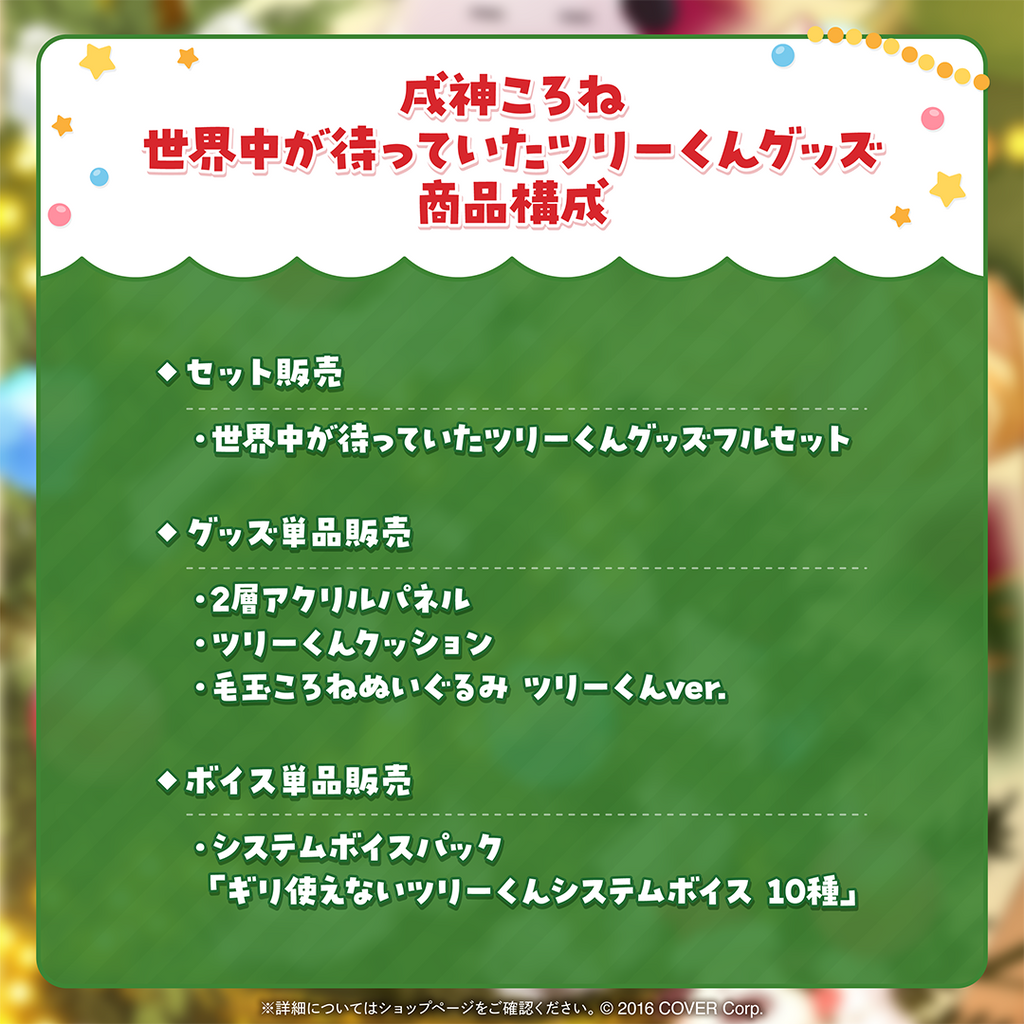 戌神ころねの世界中が待っていたツリーくんグッズのフルセット商品です。