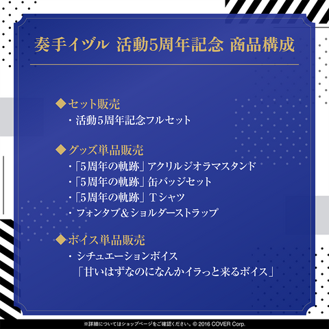 ホロライブプロダクション所属ホロスターズ「奏手イヅル」の活動5周年記念商品です。