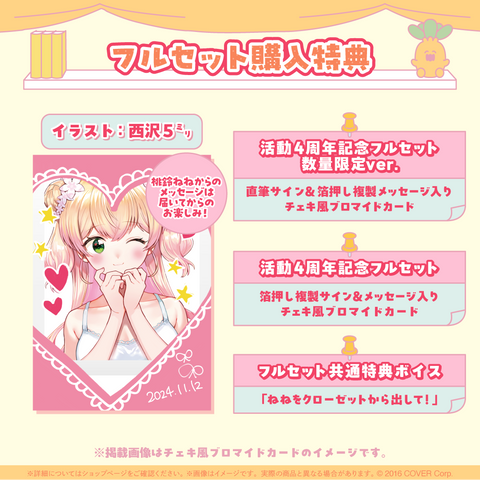 ・特典:桃鈴ねね直筆サイン&箔押し複製メッセージ入り「西沢5㍉描き下ろし チェキ風ブロマイドカード」