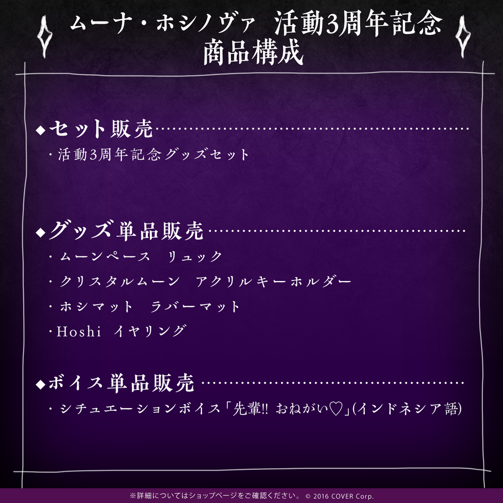 ムーナ・ホシノヴァの活動3周年を記念したグッズセット商品です。