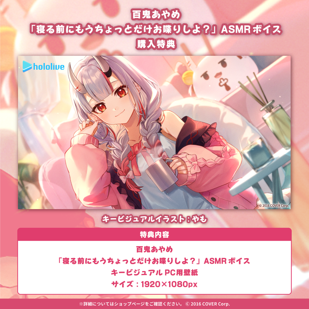 お届け予定日:原則としてご注文完了後、直ちにマイアカウントページ内「デジタルコンテンツリスト」に、ご購入いただいたボイスデータが表示されます。ホロライブプロダクション所属「百鬼あやめ」のASMRボイスが発売!