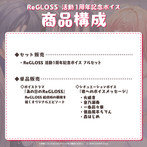お届け予定日:原則としてご注文完了後、直ちにマイアカウントページ内「デジタルコンテンツリスト」に、ご購入いただいたボイスデータが表示されます。ReGLOSSの活動1周年を記念したボイスです。