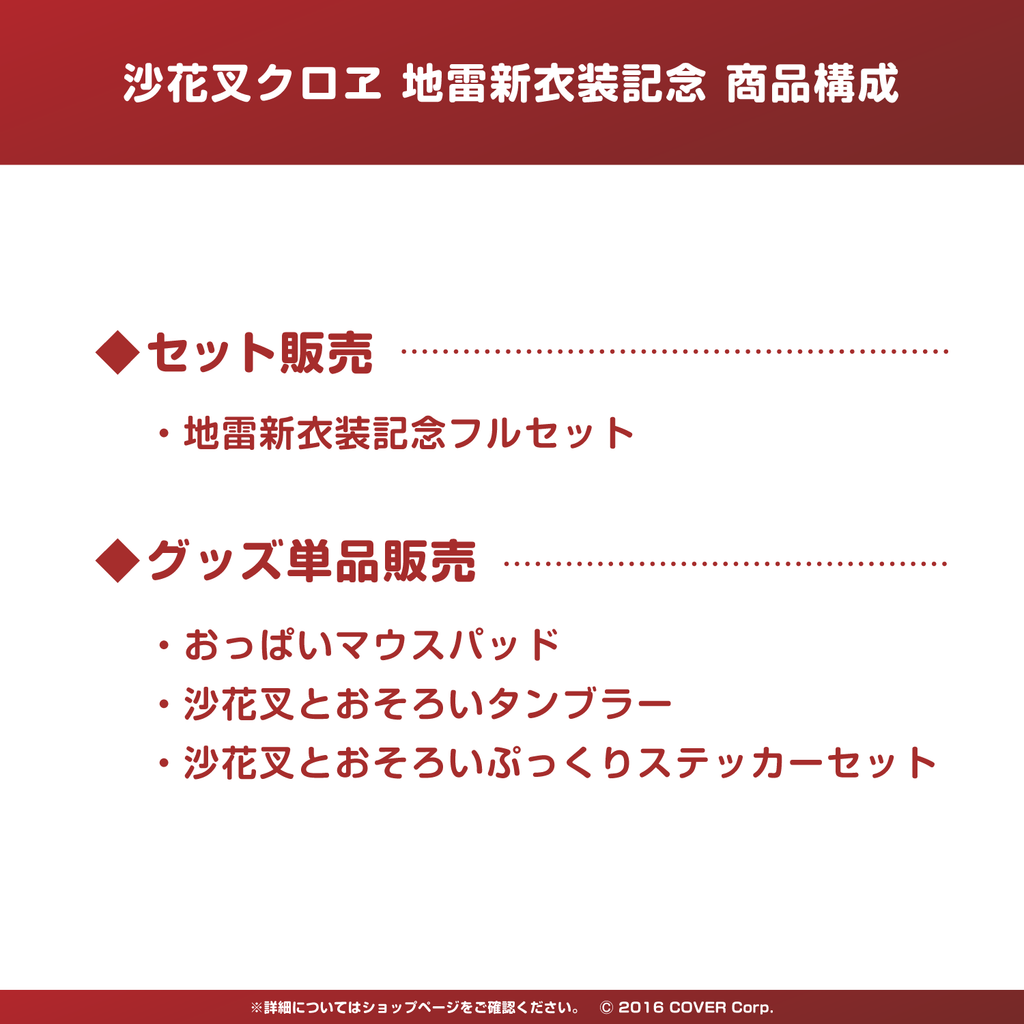 沙花叉クロヱの地雷新衣装を記念したフルセット商品です。