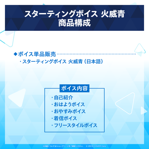 お届け予定日:原則としてご注文完了後、直ちにマイアカウントページ内「デジタルコンテンツリスト」に、ご購入いただいたボイスデータが表示されます。ホロライブプロダクション所属hololive DEV_IS「火威青」のスターティングボイスが発売!