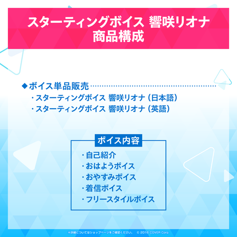 お届け予定日:原則としてご注文完了後、直ちにマイアカウントページ内「デジタルコンテンツリスト」に、ご購入いただいたボイスデータが表示されます。ホロライブプロダクション所属hololive DEV_IS「響咲リオナ」のスターティングボイスが発売!