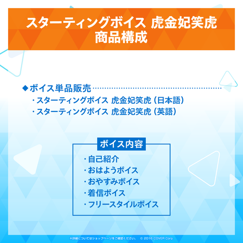 お届け予定日:原則としてご注文完了後、直ちにマイアカウントページ内「デジタルコンテンツリスト」に、ご購入いただいたボイスデータが表示されます。ホロライブプロダクション所属hololive DEV_IS「虎金妃笑虎」のスターティングボイスが発売!