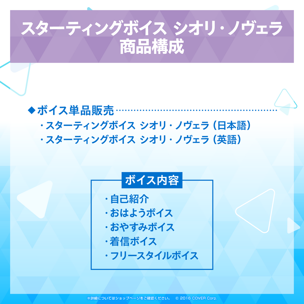 お届け予定日:原則としてご注文完了後、直ちにマイアカウントページ内「デジタルコンテンツリスト」に、ご購入いただいたボイスデータが表示されます。ホロライブプロダクション所属ホロライブEnglish「シオリ・ノヴェラ」のスターティングボイスが発売!