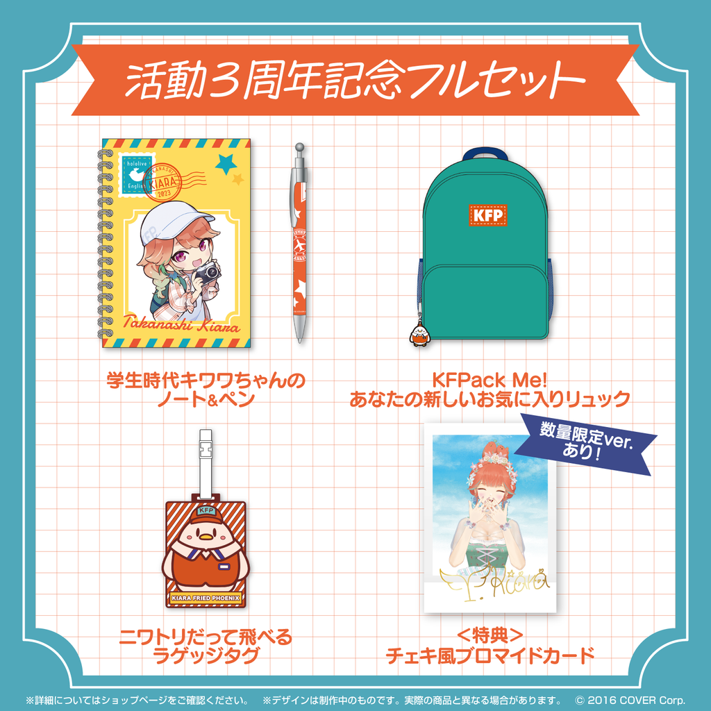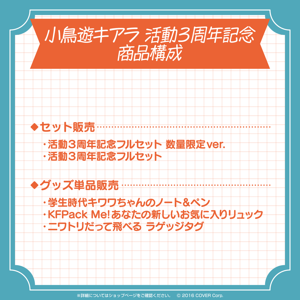 小鳥遊キアラの活動3周年を記念した数量限定のフルセット商品です。
