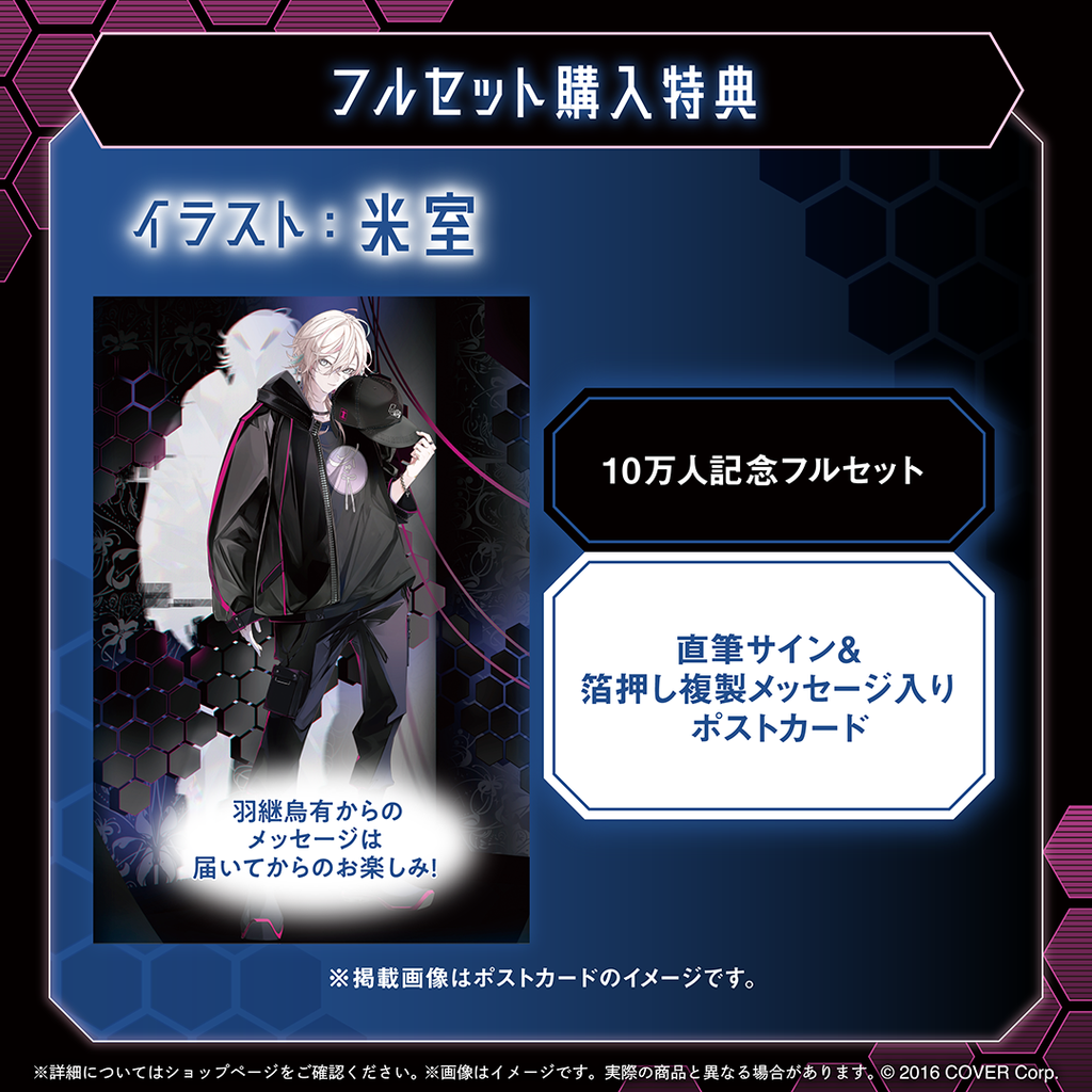 羽継烏有のチャンネル登録者数10万人達成を記念したフルセット商品です。