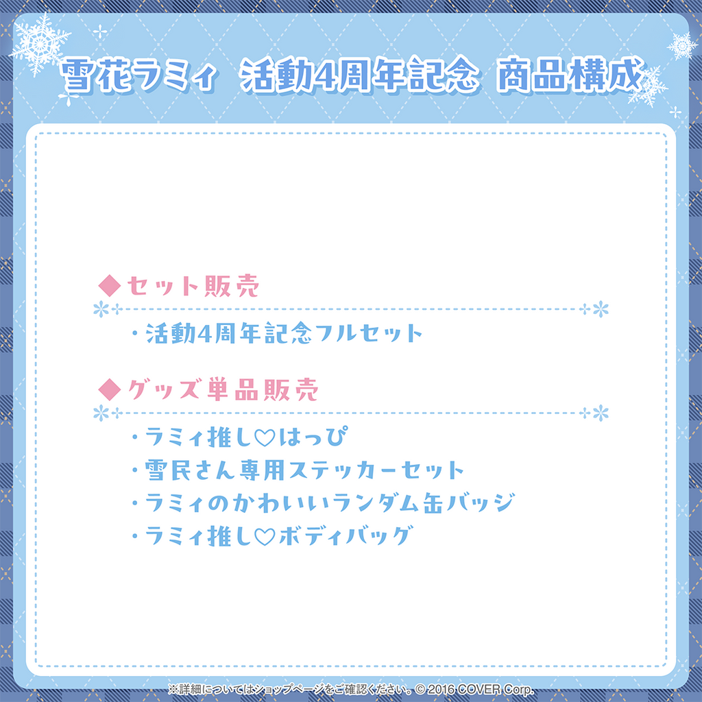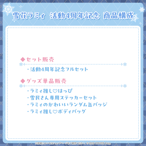 雪花ラミィの活動4周年を記念したフルセット商品です。